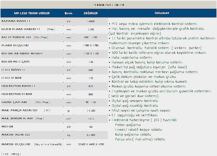 MP-1350 TON METAL ENJEKSİYON PRESİMetal Enjeksiyon Makine ÇeşitlerimizMP-160 TON METAL ENJEKSİYON PRESİMP-200 TON METAL ENJEKSİYON PRESİMP-300 TON METAL ENJEKSİYON PRESİMP-400 TON METAL ENJEKSİYON PRESİMP-550 TON METAL ENJEKSİYON PRESİMP-750 TON METAL ENJEKSİYON PRESİMP-900 TON METAL ENJEKSİYON PRESİMP-1100 TON METAL ENJEKSİYON PRESİMP-1350 TON METAL ENJEKSİYON PRESİMP-1650 TON METAL ENJEKSİYON PRESİMP-2000 TON METAL ENJEKSİYON PRESİKALIP BAĞLANTI ŞEMASI GÖRÜNTÜ VE BOYUTLARI